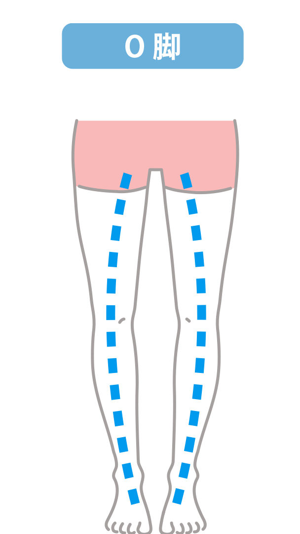 О脚とは、左右のくるぶしを揃えて立った時に膝の内側がくっつかずに離れてしまう状態のことを指します。見た目がアルファベットの「О」に見えることからО脚と言われています。