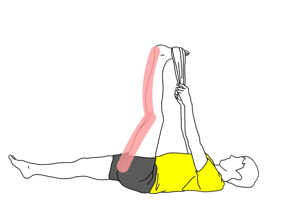 2.タオルの両端を持ち、膝を伸ばしながらタオルを胸の方へゆっくり引っ張ります。
