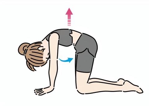2.息を吐きながら猫のように背中を丸め、おへそを覗き込むようにします。この時お腹に力を入れて凹ませるようにすると、より効果があります。