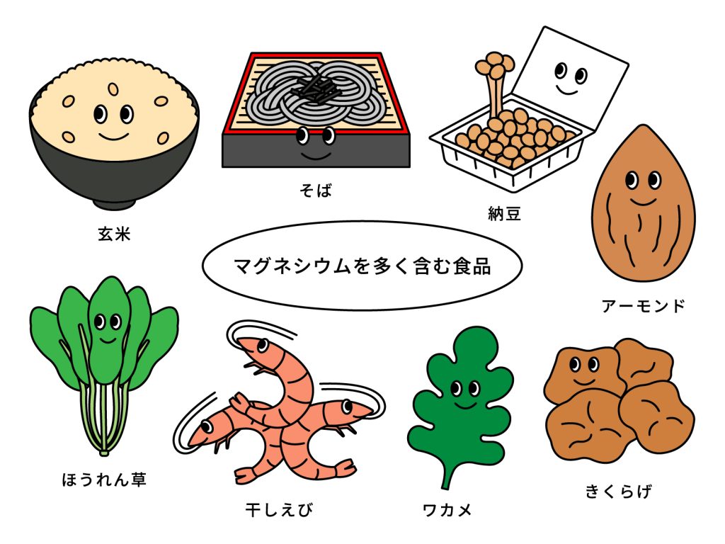 マグネシウムを多く含む食材としてひじき、ワカメ、海苔、納豆、豆腐、ナッツ類、穀類、きのこ類、ほうれん草、モロヘイヤなどがあります。