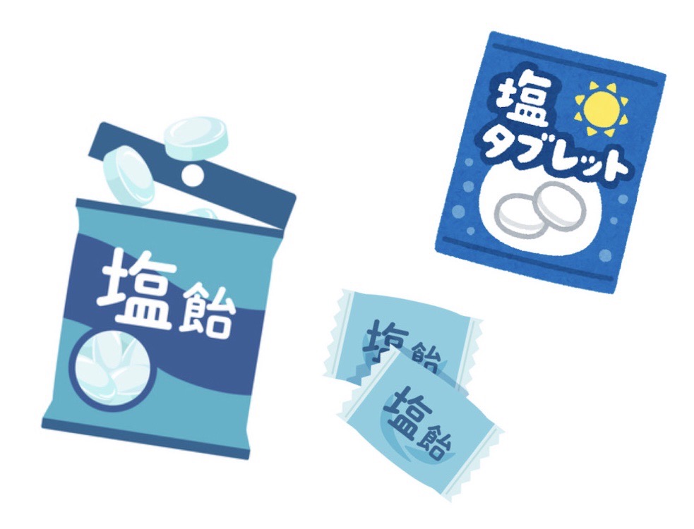 熱中症は汗を大量にかくため、体内から多くの塩分が失われます。水やお茶などでは補給できない塩分を含む飴やタブレットを摂取することも熱中症の一つの予防になります。