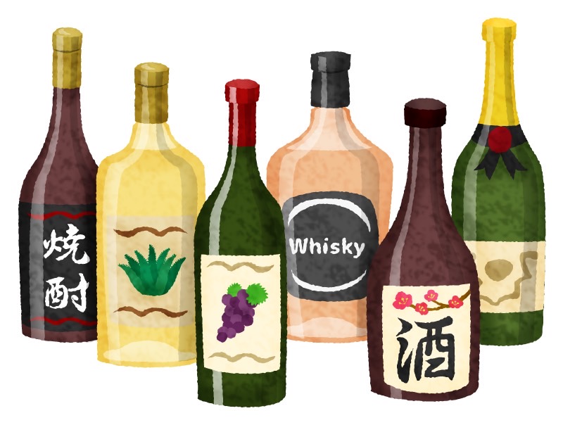 • ビール、ワイン、焼酎、日本酒、ウイスキーなど