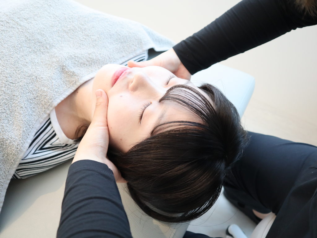 顔の骨格矯正に加え、アロマやカッサを使って筋肉をほぐし、リンパの流れを促進します。顎関節症によって硬くなった咬筋や首周りの筋肉の硬さによって顔のむくみや頭痛を引き起こしている場合もあるため、首の筋肉もほぐし、ストレッチも加えて総合的にアプローチします。また頭部や顎関節を整える手技も組み合わせることで顎関節症による嚙み合わせや左右差を整えます。