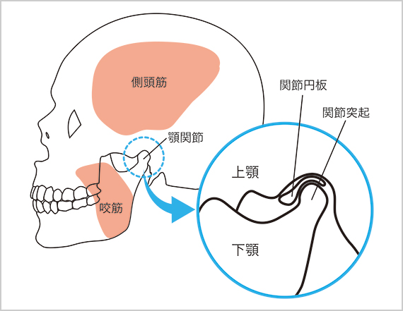 顎関節は耳の前にある小さな関節で、下あごの骨(下顎骨)と側頭骨が組み合わさって構成されています。また関節円板と呼ばれるクッションの役割をするものがあり、スムーズに動くことで食事や会話ができるのです。