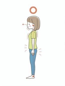立っている姿勢の時は耳、肩、腰、膝、くるぶしが一直線になっているのが正しい姿勢です。頭のてっぺんから糸で吊り下げられているようなイメージをしてみると分かりやすいかと思います。