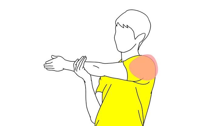 ①片手を手のひらを天井に向け前方に伸ばし、反対側の手で肘を支えます。