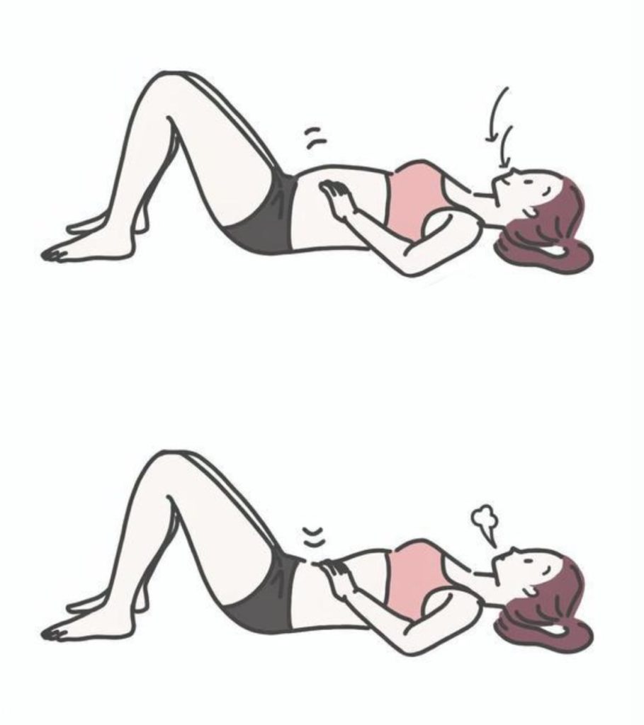 ①仰向けになって鼻から息を吸ってお腹をふくらませます。