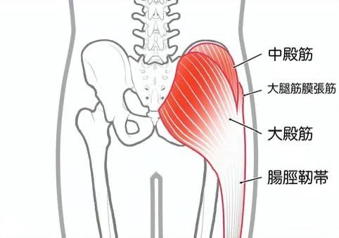 おしりの中で最も大きい筋肉で、歩行時の足の蹴り出しや股関節の動き、体幹を安定させるために重要な筋肉です。