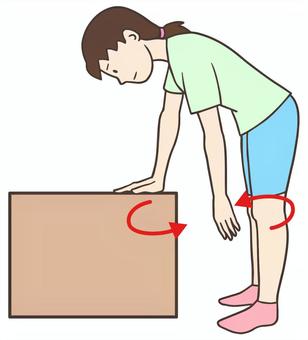 椅子に片手をつき、上体を少し前に倒してもう片方の腕を自然に垂らす。そのまま腕を小さく円を描くように揺らす。関節に過度な負担をかけず、肩を動かすことができます。