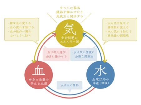 「気」「血」「津液」は身体のバランスをとるため互いに作用し合っています。このどれかが少なくなったり多くなっても身体の状態としては崩れてしまうという考えが東洋医学の考え方です。