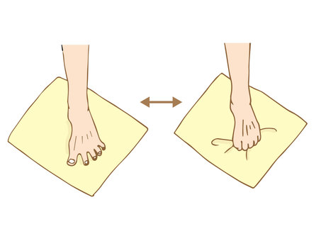タオルを床に置き、足の指で手前にたぐり寄せる。これにより足裏の筋肉が強化され、アーチが保たれる。