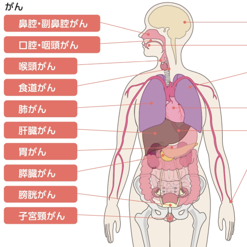肺がん、咽頭がん、口腔・咽頭がん、食道がん、胃がん、膵臓がん、膀胱がんなど全身のがんに関係しています。