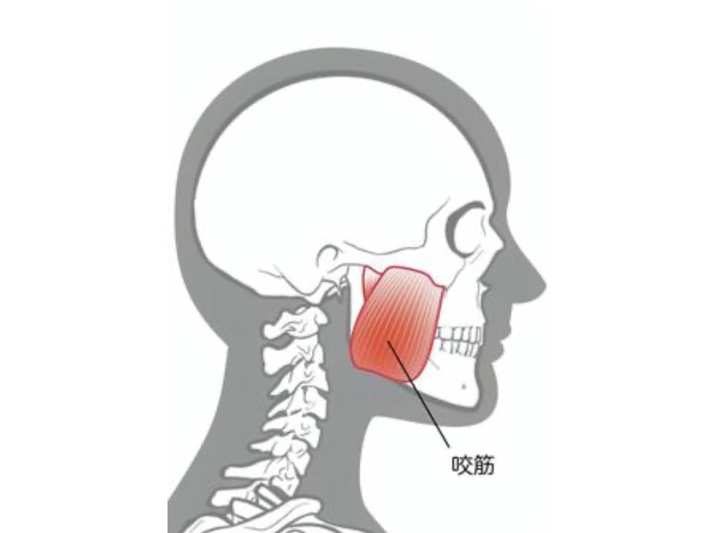 頬骨の下から下顎角にかけて付着する筋肉で、硬いものを噛み砕く時に強い力を発揮します。ストレスなどによって、歯ぎしりや食いしばりが強いと咬筋が過度に発達し、エラが張ったり頭痛や肩こりの原因にもなります。