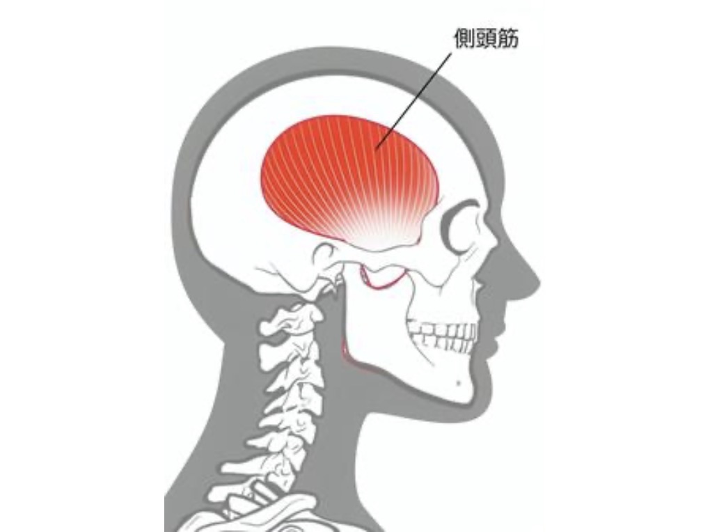 頭の側面にあり、こめかみ辺りから耳の上にかけて広がる筋肉です。咀嚼するときに使われ、下顎を上に持ち上げるたり後ろに引いたり、左右に動かしたりする働きがあります。食いしばりや歯ぎしり、ストレス、デスクワークなどで無意識に緊張しやすい筋肉です。