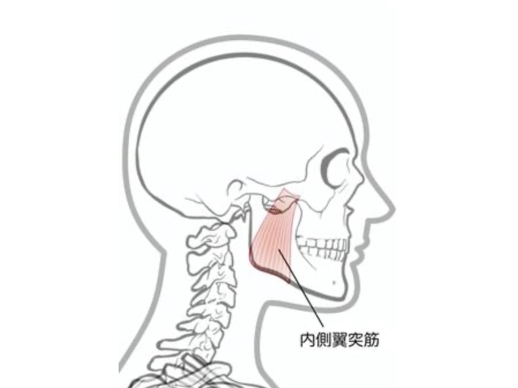 下顎骨の内側にあり、外側にある咬筋と協調して下顎骨をサンドイッチのように挟む形をしています。内側翼突筋が収縮すると、下顎骨が上に持ち上がり、物を噛む(閉口)動作を助けます。片側だけが収縮した場合は、下顎が横に移動するのを助ける役割も担っています。