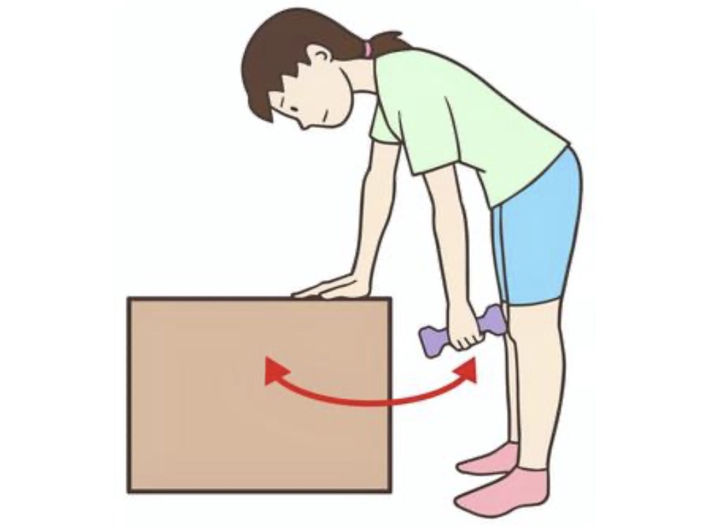 2.身体を少し前に傾け、肩の力を抜き、痛む方の腕をだらんと下におろします