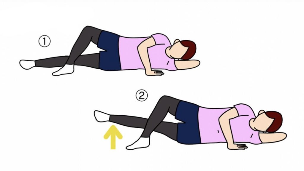①身体を横向きにして寝転がり、下の腕で頭を軽く支え、上の腕は胸の前あたりに身体を支えます。
