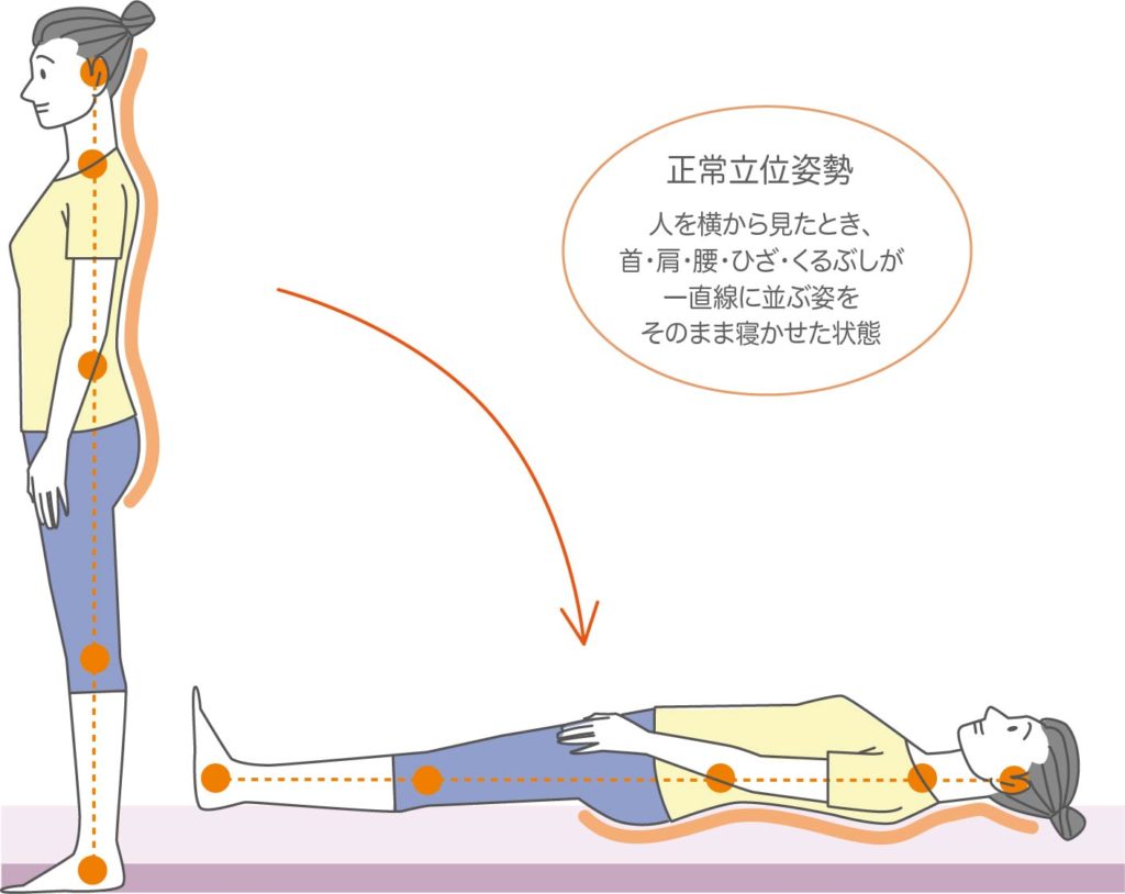 理想の寝姿勢を 「立っている姿勢をそのまま横にした状態」 とお伝えしています。