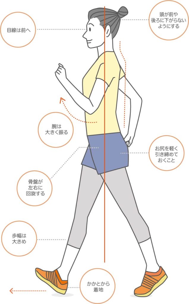 また、腕をしっかり後ろに引くように振ることで、背中や体幹の筋肉も使われ、姿勢改善にもつながります。