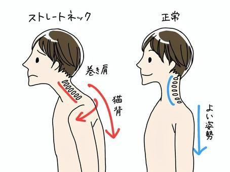 スマホやパソコン作業で長時間うつむいた姿勢(猫背姿勢)では頭が前に出てしまい、バランスを取ろうと首のカーブが無くなり真っ直ぐな状態になります。ストレートネックの状態が続くことで、首肩周りの筋肉に負担がかかり、慢性的な首肩こりや痛みにつながります。